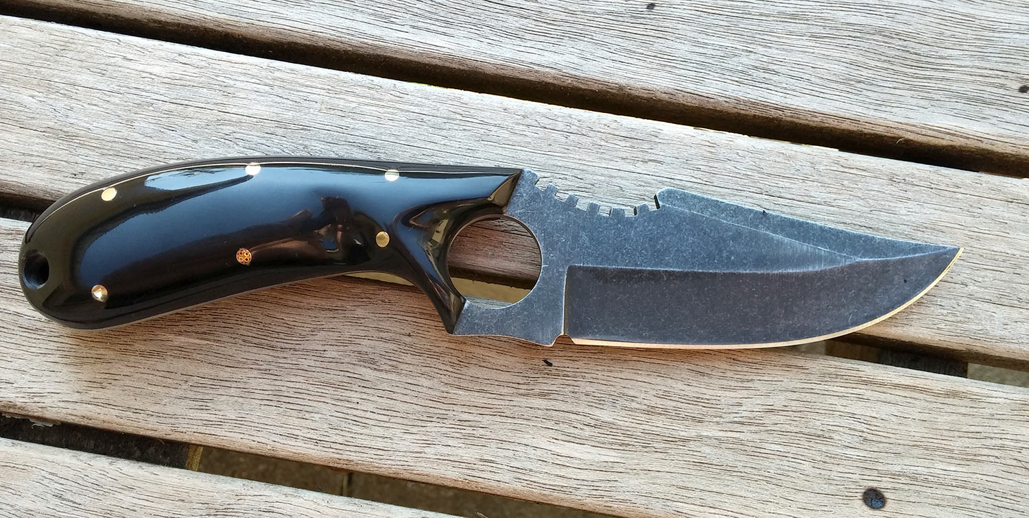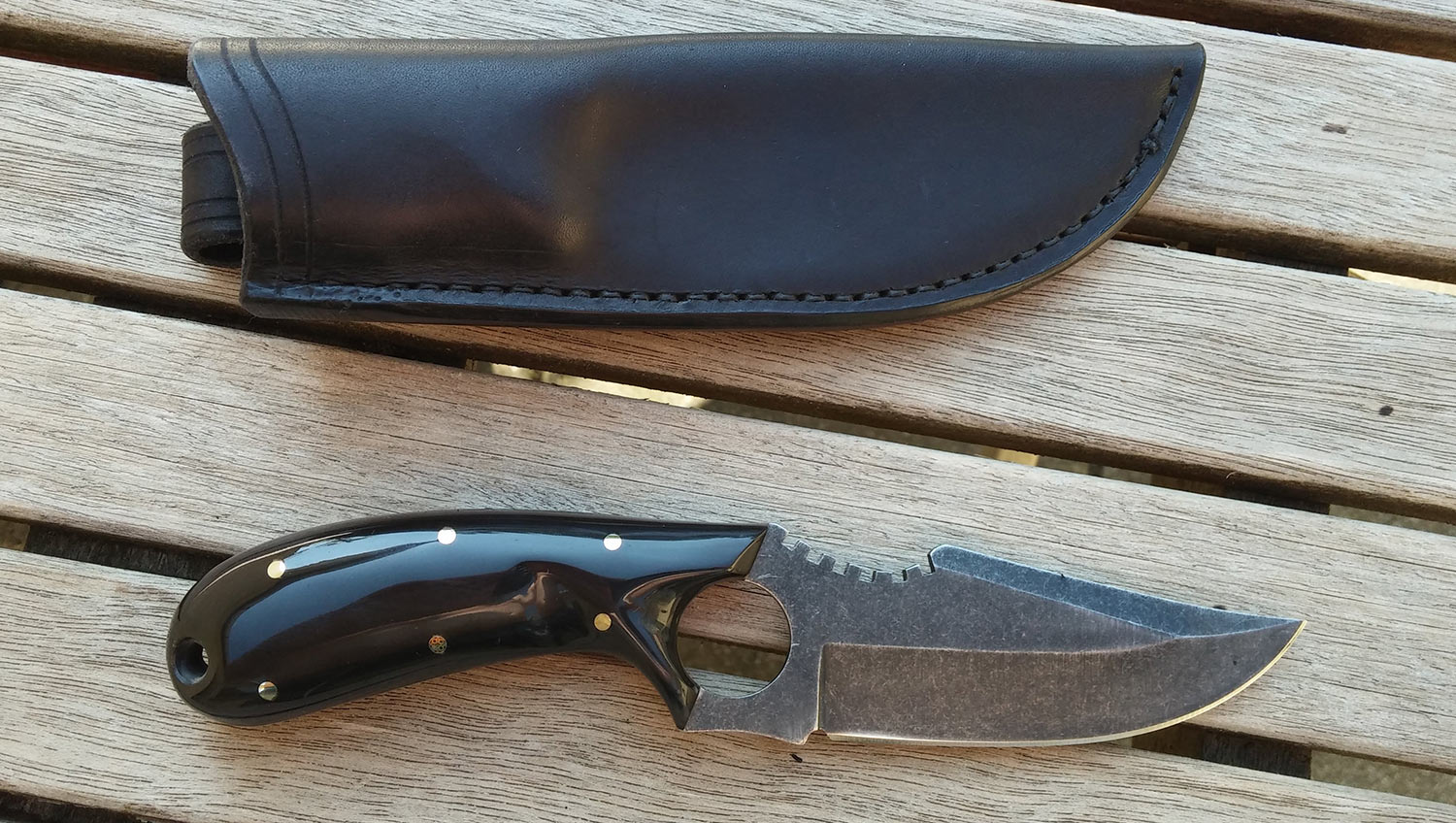 “Stonewashed” skinner med sort ibenholt træ skæfte.