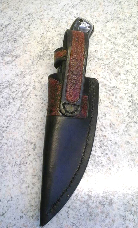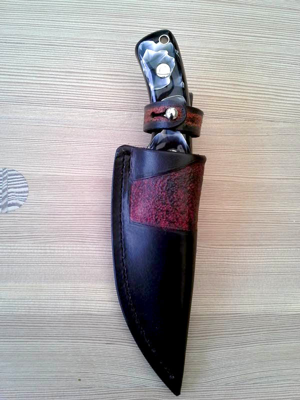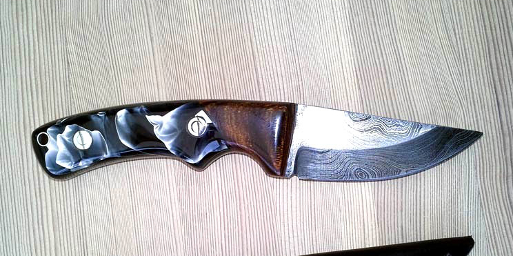 Lækker Damask klinge med skæfte af TechStab 3D og kirsebær træ.