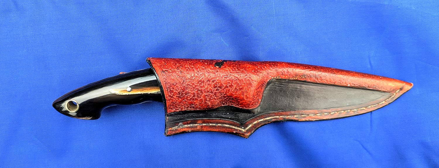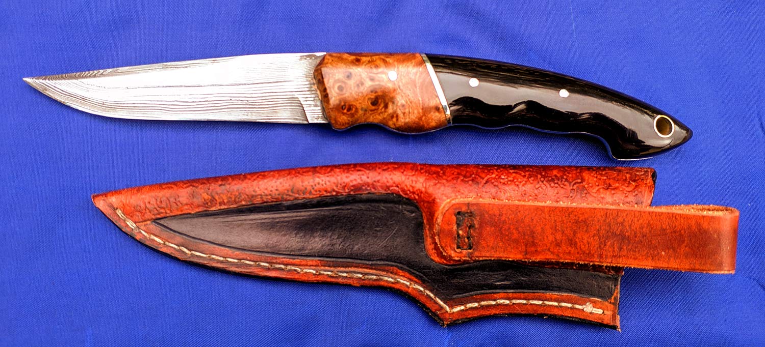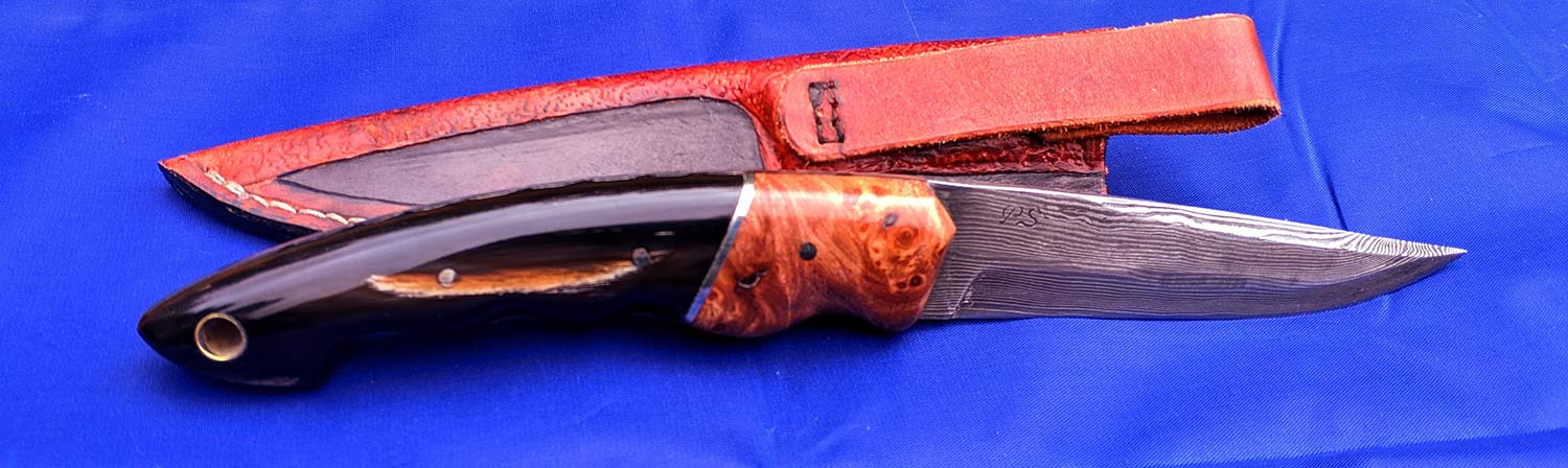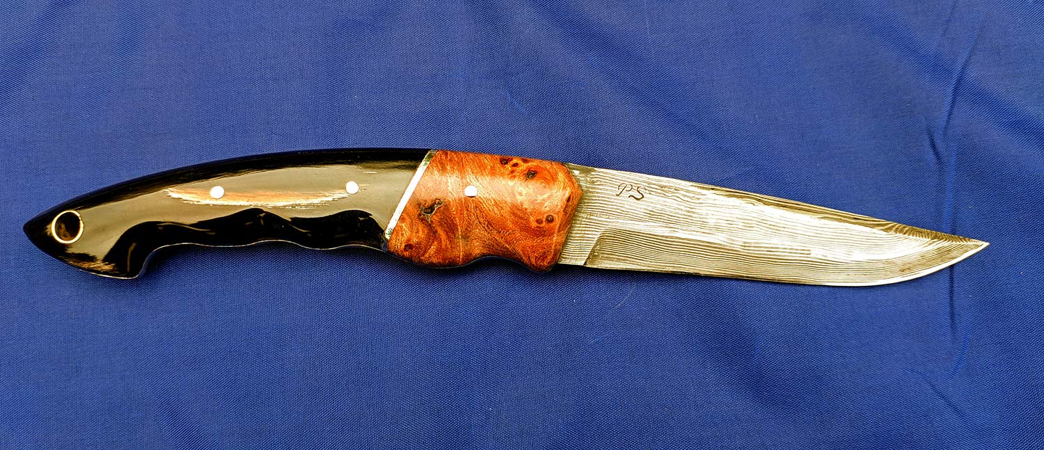 Skæftet er af sort Indisk vandbøffelhorn og stabiliseret elmeknude, med mellemlæg af sølv.