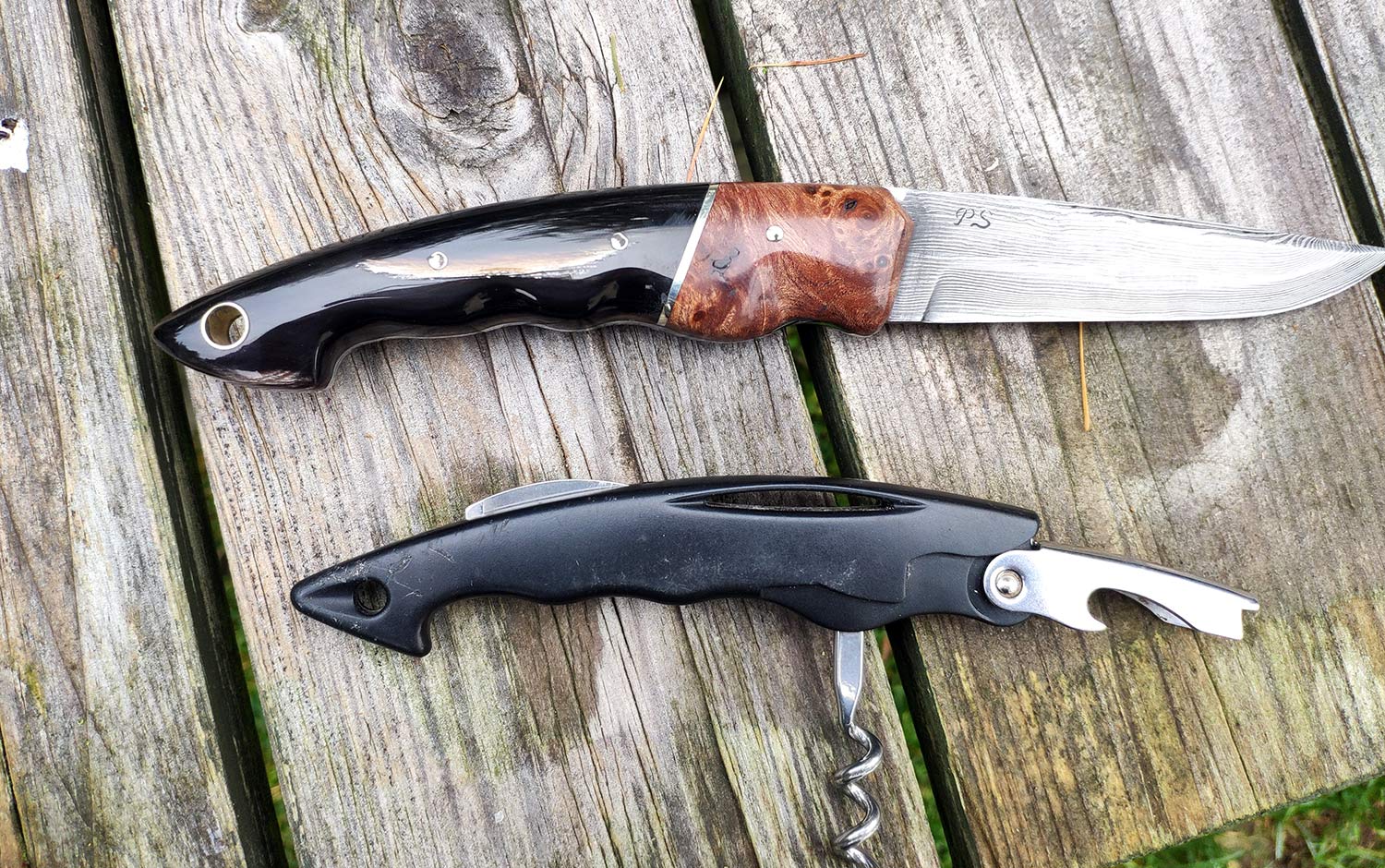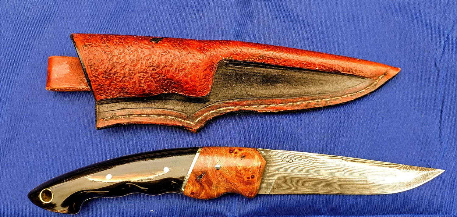 Klingen er en håndsmedet damask klinge af Poul Strande.